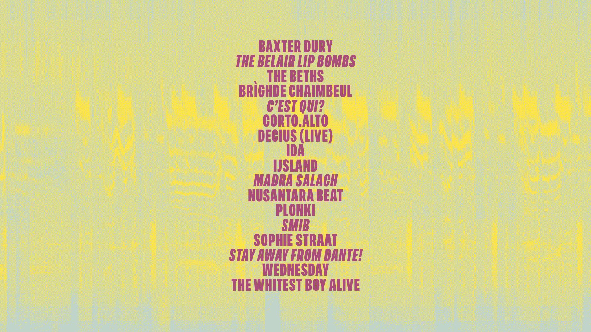 Baxter Dury - The Belair Lip Bombs - The Beths - Brìghde Chaimbeul - C'est Qui? - corto.alto - Decius (Live) - IDA - IJSLAND - Madra Salach - Nusantara Beat - plonki - SMIB - Sophie Straat - stay away from dante! - Wednesday - The Whitest Boy Alive